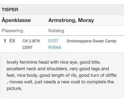 Smörsoppens Sweet Candy "Socker" som nu är omdöpt till tjocker fick ändå E-3 CK och domaren tyckte väldigt mycket om henne så placerade henne 5-BT som egentligen inte finns längre :-)